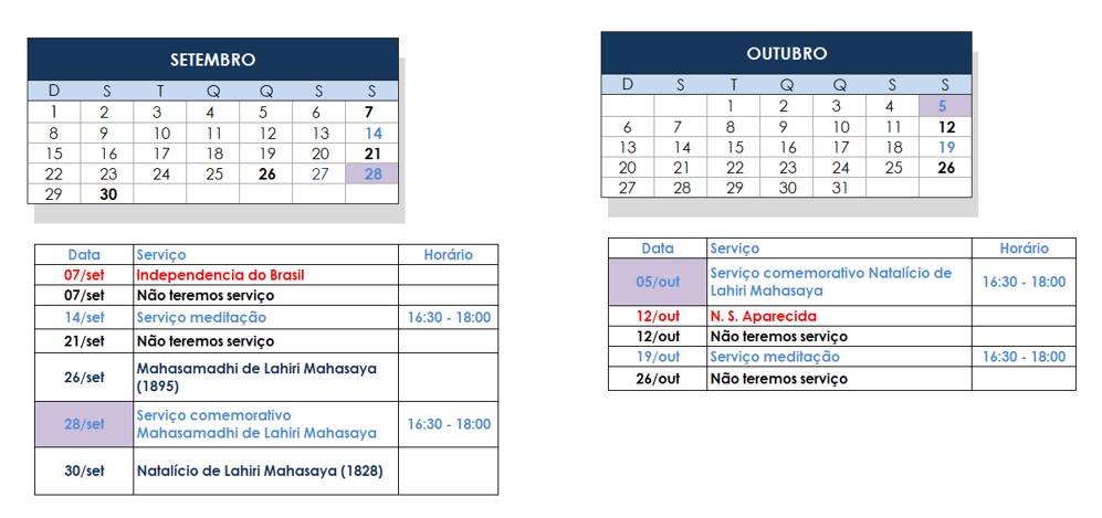 O Círculo se reúne todos os sábados a partir das 16:30 em Marília, na rua Sete de Setembro nº 1372. O Hotel Sun Valley é uma referência de localização próxima. O serviço oferecido é o serviço de meditação curta (1 hora de duração), precedida pelos Exercícios de Energização (para os estudantes da SRF) e ao final, o serviço do Círculo Mundial de Preces. Uma vez por mês oferecemos o serviço de meditação longa, com 2 horas de duração. Contamos com uma pequena livraria, que funciona aos sábados das 16:30 - 17:00, antes do serviço de meditação. Na livraria podem ser adquiridas as obras de Gurudeva, como a Autobiografia de um Iogue. Pedimos aos devotos que cheguem com pelo menos 10 minutos de antecedência e aqueles que virão pela primeira vez, que liguem ou peçam por e-mail a confirmação do serviço. Será motivo de enorme alegria ter a sua companhia em nossos serviços. |